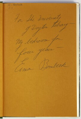 Displayed in the exhibit Beyond the Byline: Erma Bombeck's Story, held Feb. 1 through June 15, 2024, in the Stuart and Mimi Rose Gallery in Roesch Library. Item is part of the Erma Bombeck Papers, housed at the University of Dayton.