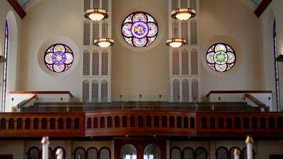 Stained-glass rose windows are above the choir loft, west interior wall of Immaculate Conception Chapel.