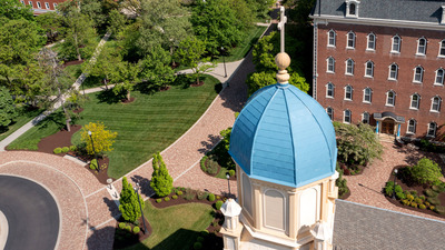 Aerial view is of the lawn east of Albert Emanuel Hall and Roesch Library, looking northwest from above the cupola of the Chapel of the Immaculate Conception. St. Mary's Hall and the chapel cupola are visible in the right third of the frame.