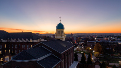 Aerial view of St. Mary's Hall, Chaminade Hall, Chapel of the Immaculate Conception, and St. Joseph Hall looking east at sunrise from above the Olsen Athletics Performance Center (formerly Reichard Hall), west of the Frericks Center.