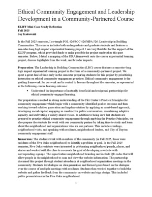 This essay describes a semester-long, community-partnered leadership project in which students collaborated with Five Oaks residents to co-create neighborhood storytelling tools grounded in ethical community engagement and PIRA.